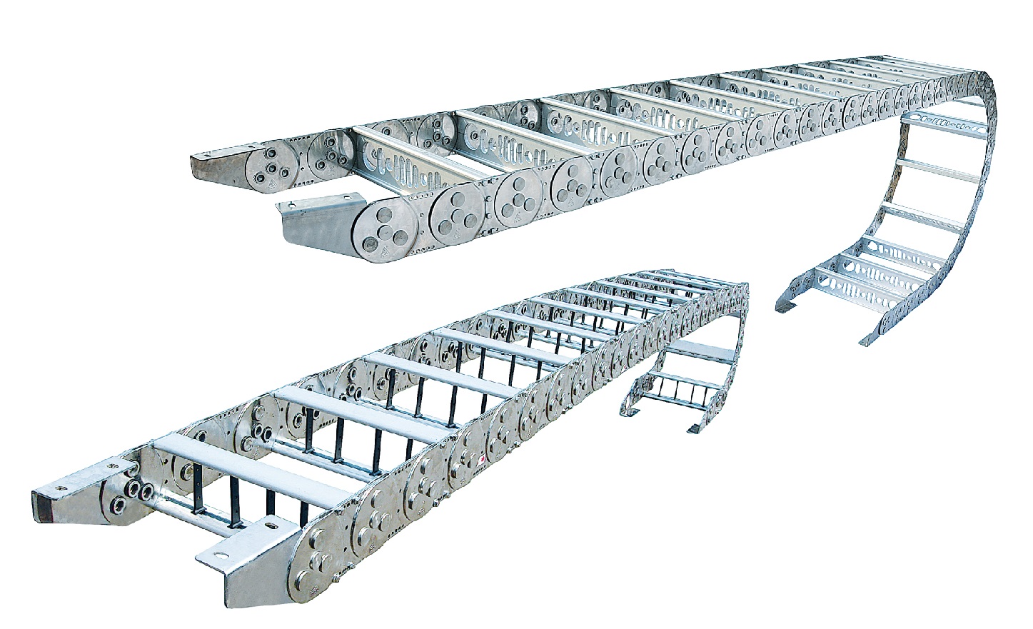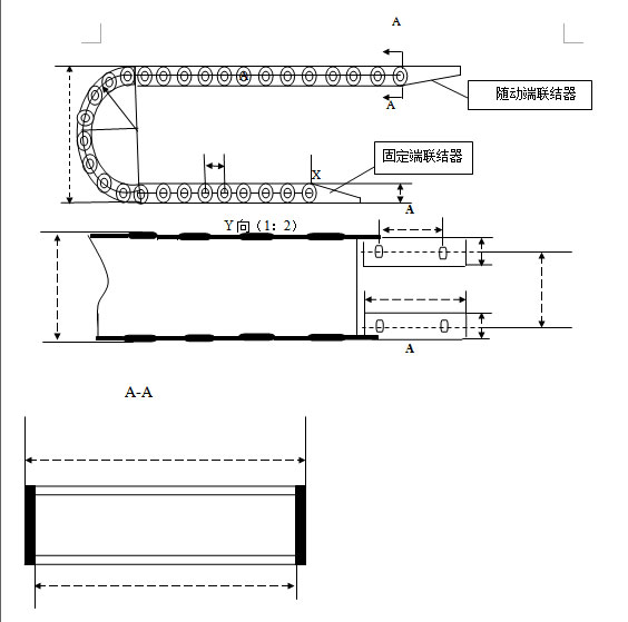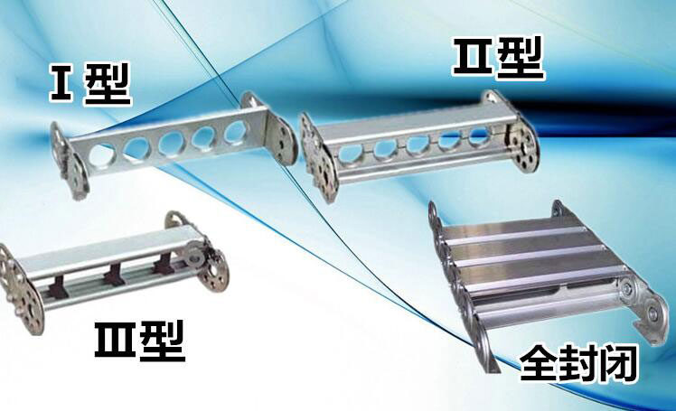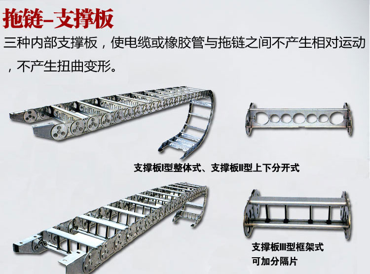 1、可承載數量多,重量大的電纜及油管,自由懸置(允許不用支承輪)長度大,支撐板可依顧客需要制作,適用于工作母機,移動機械等。其彎曲半徑為50-600mm,鏈板高度為35-150mm,可任意選用。