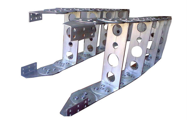 (3)單元鏈節由左右鏈板和上下蓋板組成,鋼鋁拖鏈每節都能打開,裝拆方便,不必穿線,打開蓋板后即可把電纜、油管、氣管、水管等放入鋼制拖鏈。