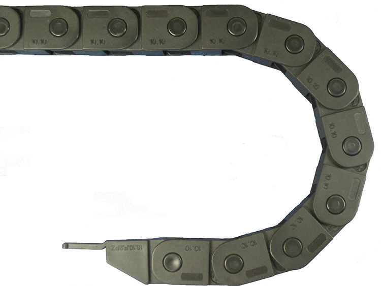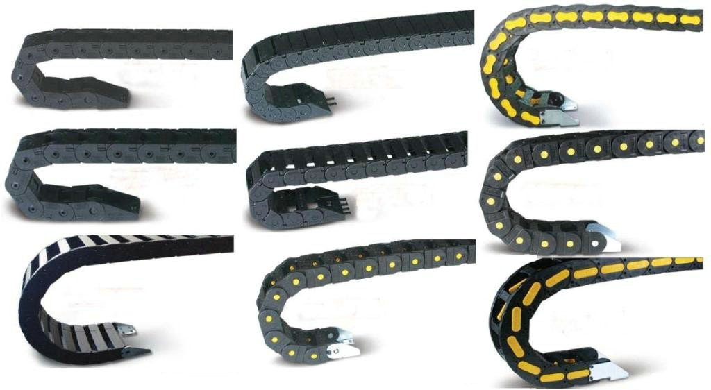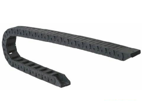 單元鏈節由左右鏈板和上下蓋板組成,尼龍拖鏈每節都能打開,裝拆方便,不必穿線,打開蓋板后即可把電纜、油管、氣管等放入拖鏈內。