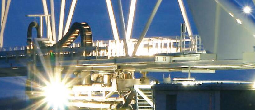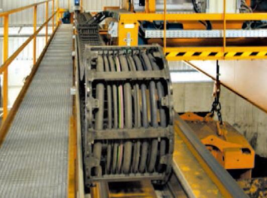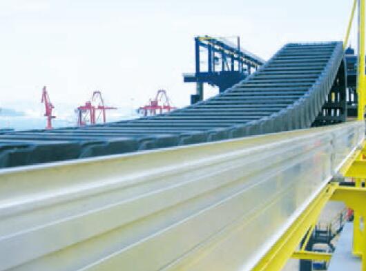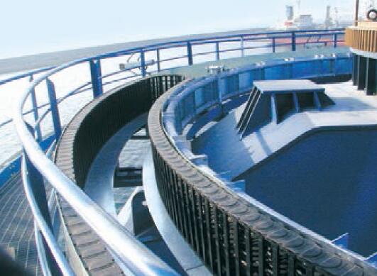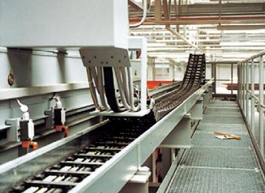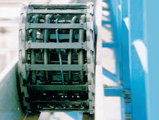 帶拓展鏈節(jié)的 E4 拖鏈用于裝船機(jī)上的煤塊裝卸。行程 105 m,速度 240 m/min,載重 53 kg/m。