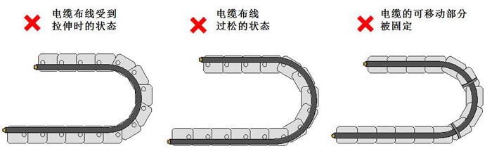 如果電纜在布線時受到張力拉伸,會與拖鏈的內壁產生摩擦導致護套磨損。反之如果布線過于松散,同樣也會與拖鏈的內壁產生摩擦造成護套磨損,并且容易與其他的 電纜產生纏繞現象。電纜的布線長度應設定在剛好能通過拖鏈的中心線為宜。