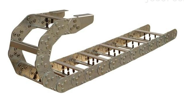 鋼鋁拖鏈分為TL系列鋼鋁拖鏈和TLG系列鋼鋁拖鏈,外形與坦克鏈相似,由眾多單元鏈節組成,鏈節之間轉動自如。相同系列的拖鏈內高、外高、節距相同,拖鏈內高、彎曲半徑R可有不同的選擇。單元鏈節由左右鏈板和上下蓋板組成,鋼鋁拖鏈每節都能打開,裝拆方便,不必穿線,打開蓋板后即可把電纜、油管、氣管等放入拖鏈內。另可提供分隔片,將拖鏈內空間按需要分隔開。