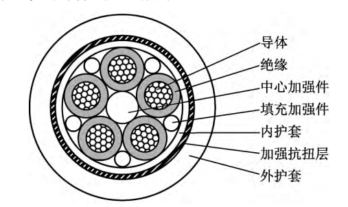2.為了加強(qiáng)整根電纜結(jié)構(gòu)強(qiáng)度,保證電纜的耐用性,采用了中心加強(qiáng)件。中心加強(qiáng)件由芳綸紗以及芳綸紗外部擠包成型的輻照型乙丙橡膠層組成。為了將各纜芯分隔開提高絕緣效果,同時(shí)加強(qiáng)結(jié)構(gòu)強(qiáng)度提高抗拉和抗壓能力,采用了填充加強(qiáng)件。填充加強(qiáng)件采用了細(xì)萱麻繩,其在實(shí)現(xiàn)以上目的的同時(shí),也不會(huì)過多增加電纜的重量。