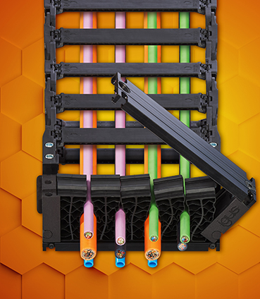 新款CFU的拖鏈接頭連接平整,可用于架空和滑行應用。這種產品也可對應拖鏈的不同寬度。各種電纜可直接垂直布入CFU,然后閉合CFU并擰緊。側板上的卡爪可連接拖鏈和去應力元件。通過蜂窩式去應力元件,工程師能夠在確定具體的電纜型號之前就對拖鏈和去應力進行規劃設計, 并且在后續實施中,可以進行靈活的改裝。這款蜂窩狀去應力元件目前是為E4.1L拖鏈特制的。特制的蜂窩式去應力元件搭配定制化的內部分隔系統,讓E4.1L拖鏈成為目前市場上最易于布置電纜的拖鏈系列。